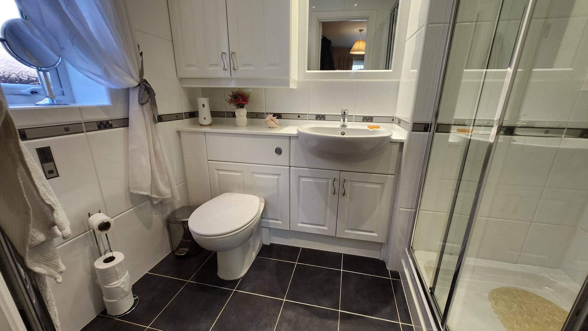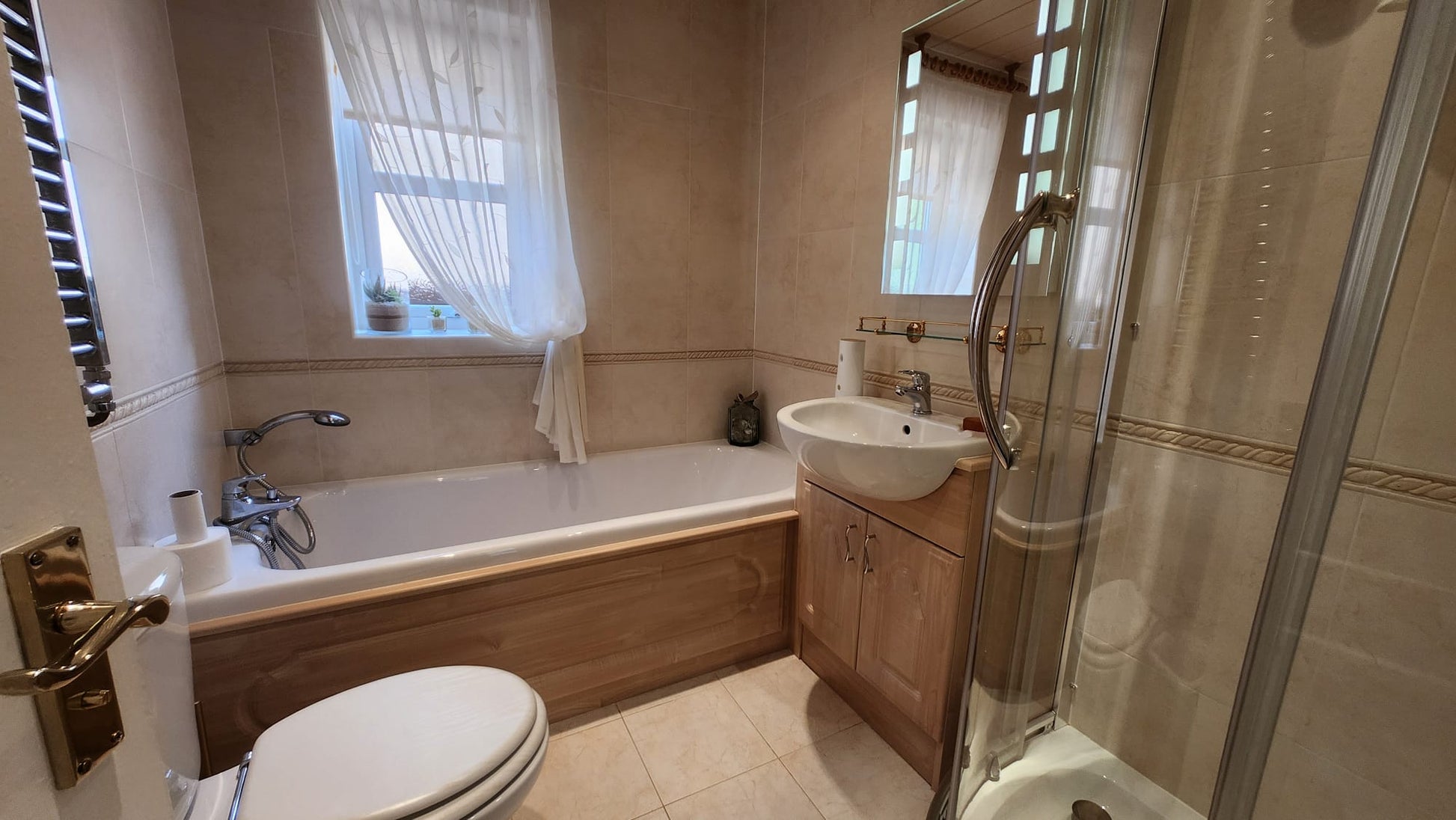 The fully tiled bathroom features both a bath and separate shower cubicle, along with a modern sink unit and WC ā all beautifully maintained.